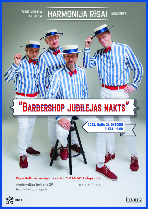 On October 21, 2022 at 19.00 in the Great Hall of the Riga Culture and Leisure Center "Imanta" the anniversary concert "Barbershop anniversary night" by the male vocal ensemble "Harmonija Rīgai" .