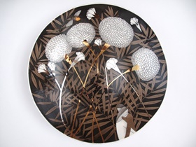 The artist’s handwriting in the ceramics of Latvia is marked by individualized stylization of the figurative and nature motifs. The aesthetics of the pieces is created by arranging the mixtures of lines and colours in fine and rhythmical compositions dominated by a circular shape. In the porcelain pieces the range of the porcelain white up to various other colours and their hues are used. The overall colouring can be described as monochrome – the land colour range is supplemented with golden and platinum accents.