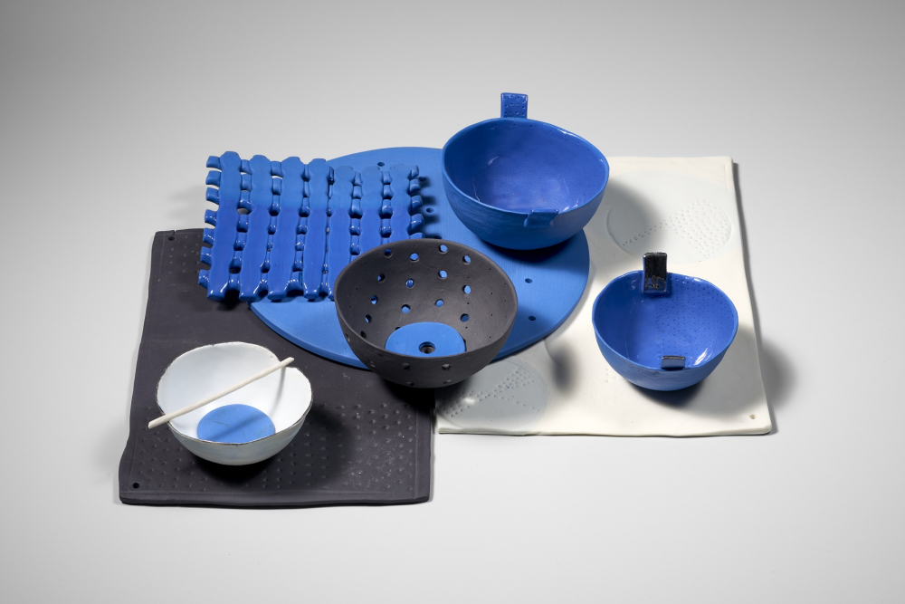For her solo exhibition “Conversations over Coffee”, the artist has returned to porcelain and is experimenting with the technological possibilities it has to offer. Working with tinted porcelain – white, blue and dark brown porcelain body – has proved particularly exciting. Various functional as well as decorative elements have been created free-hand. The surface of the objects is left unglazed in some places in order to highlight the beauty of the material, while in other places it is painted with silver and gold in a minimalist way, as well as decorated with surface incisions: engravings and impressions. The artist’s work is characterised by elegance and scrupulous attention to surface treatment, thoughtful colour combinations and subtle details in decoration.