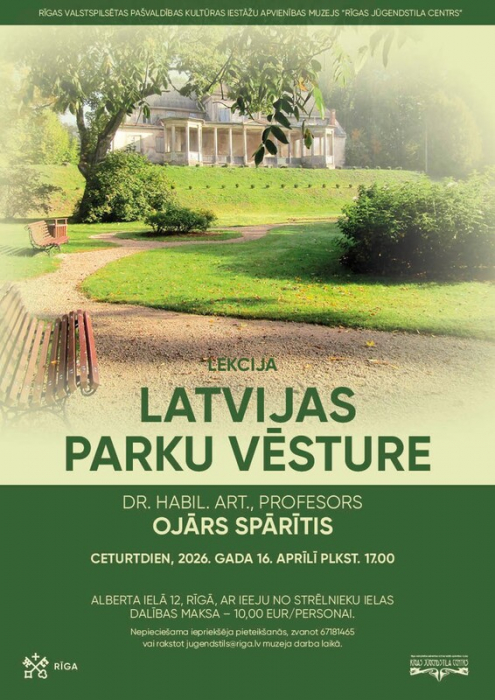 2026. gada 16. aprīlī plkst. 17.00 muzejs “Rīgas Jūgendstila centrs” aicina uz profesora Ojāra Spārīša lekciju “Latvijas parku vēsture”. Turpinot muzeja lekciju ciklu, aicinām interesentus uz izzinošu klātienes tikšanos, lai ielūkotos parku mākslas attīstībā un vides veidošanas principos Latvijā.