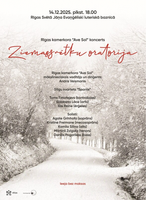 Jau ik gadu tradicionāli adventes laikā skan “Ziemassvētku oratorija”, kurā Rīgas kamerkoris “Ave Sol” mākslinieciskā vadītāja Andra Veismaņa vadībā piedāvā Kamila Sensānsa opusu. Šoreiz tas izskanēs Rīgas Sv. Jāņa evaņģēliski luteriskajā baznīcā, sadarbojoties ar dievnama ērģelnieci unsolisti Ilzi Reini. Solo partijas izpildīs pieci spoži kora un operas solisti, kuru balsis savīsies ar stīgu kvarteta “Sponte” izpildījumu – vijolniecēm Martu Spārniņu un Lieni Neiju-Kalniņu, kā arī altistu Ivaru Brīnumu un čellistu Ēriku Kiršfeldu. Viņiem pievienosies kontrabasists Toms Timofejevs un arfiste Elizabeta Lāce.